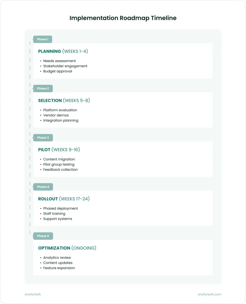 - Choose a platform or develop custom solutions following the needs assessment. If you are adopting an existing platform, request demonstrations that include healthcare-specific scenarios rather than general examples. Test with actual content and user workflows, and verify integration capabilities through technical documentation, not just vendor claims. If building custom solutions, ensure your development partner understands healthcare regulations and has relevant experience.