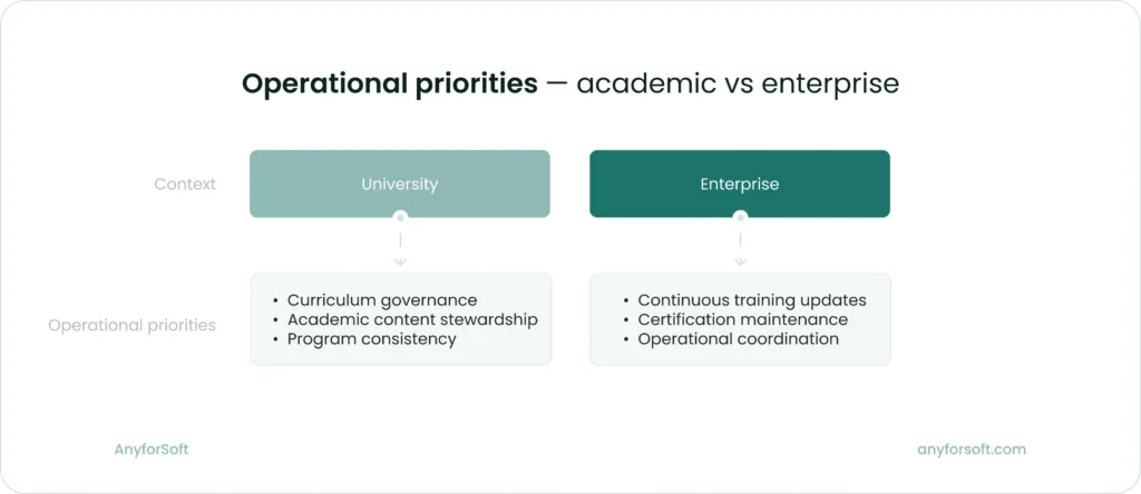 When architecture decisions lead the process, one principle stands out. Whether you’re structuring an academic learning environment or an enterprise training system, the decision framework is shared — only the priorities differ.