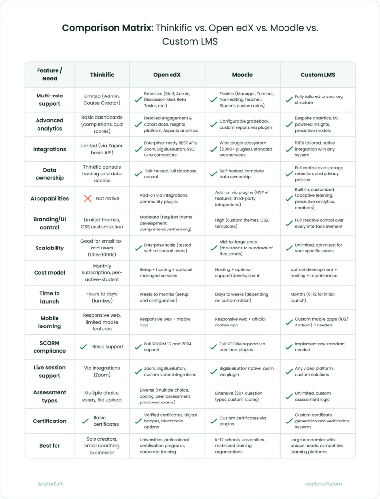 This guide compares three strong Thinkific competitors: Open edX, Moodle, and custom-built platforms. We’ll look at them through the lens that matters to you – multi-role management, analytics depth, integrations, and data ownership – so you can make an informed, strategic choice.