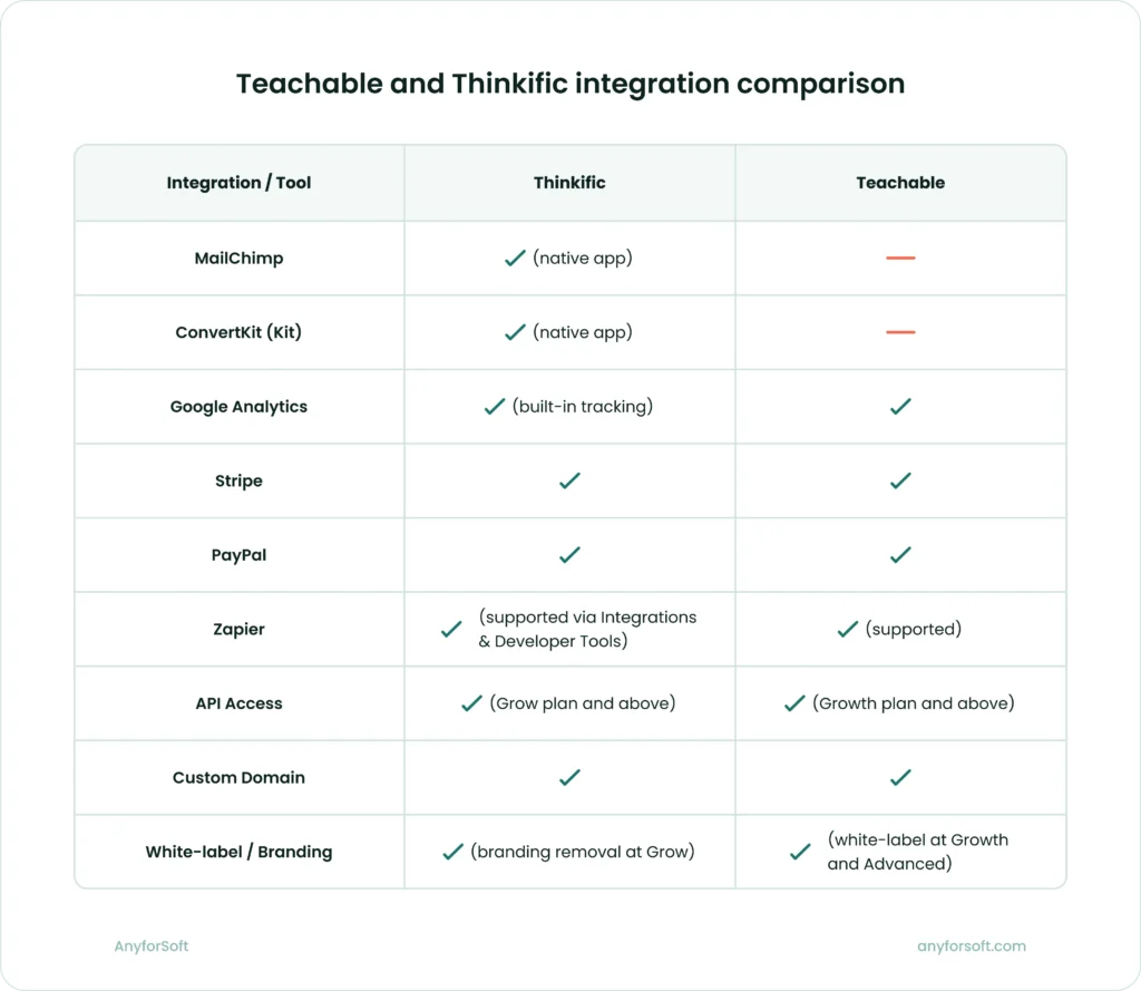 On both platforms, advanced integrations are gated behind higher-tier plans. Teachable unlocks API and Webhooks at the Growth plan, while Starter and Builder do not include direct API access. Thinkific also reserves advanced integrations, such as CRM, API, SCORM, and SSO, for its Grow plan and above.