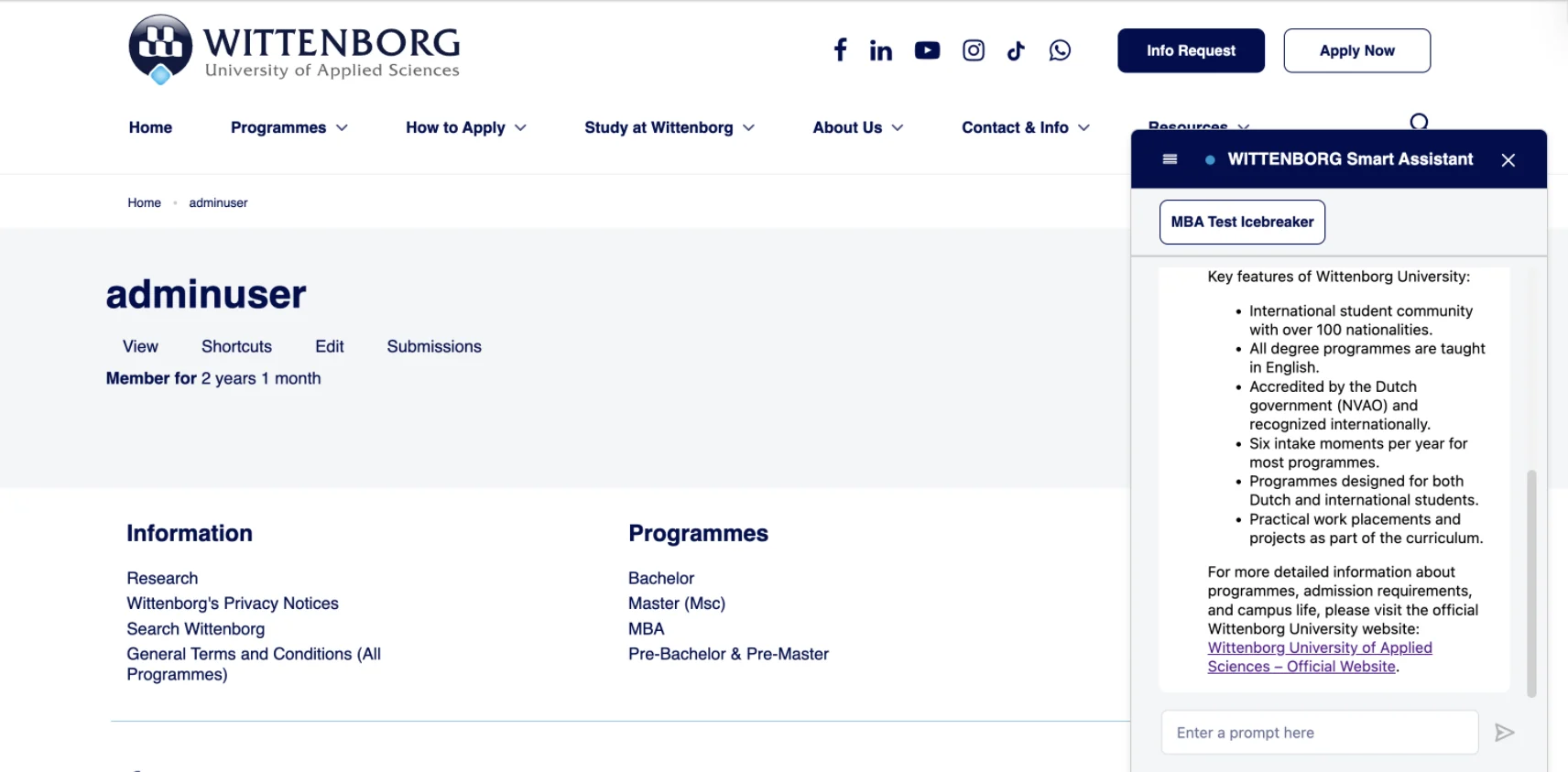 Following their website redesign, Wittenborg University of Applied Sciences (WUAS) added an AI assistant for new applicants and current students. It answers questions about admissions, programs, and student life at the moment they are asked.